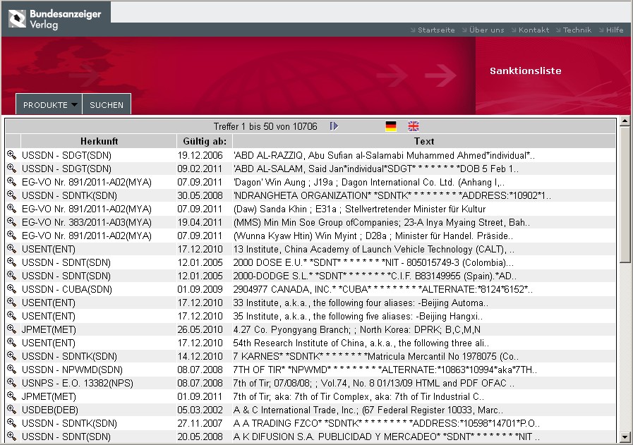 Die Eingangsmaske zeigt Ihnen zunächst die ersten 50 Einträge der Gesamtliste alphabetisch sortiert.