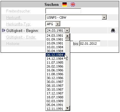 Sobald Sie sich für eine Suche nach Gültigkeit - Beginn entscheiden, zeigt die Leiste 'Suchbegriff' verschiedene Datumsangaben, die den Gültigkeitsbeginn einer Maßnahme darstellen: