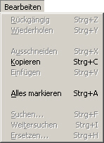 Entspricht dem von Microsoft Word bekannten Menüpunkt 'Bearbeiten' mit den Inhalten 'Kopieren', 'Rückgängig', 'Markieren' usw. So können Sie z. B. einzelne Zeilen mit der Maus markieren, über den o. a. Menüpunkt kopieren und in ein Worddokument einfügen.