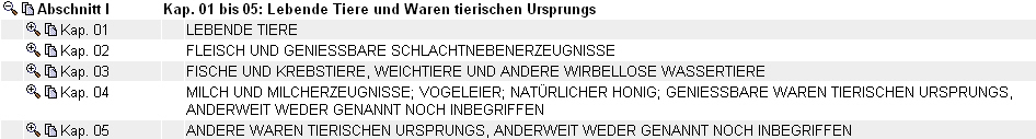 So beinhaltet z. B. der Abschnitt I "lebende Tiere und Waren tierischen Ursprungs" und umfasst die Kapitel 01 bis 05.